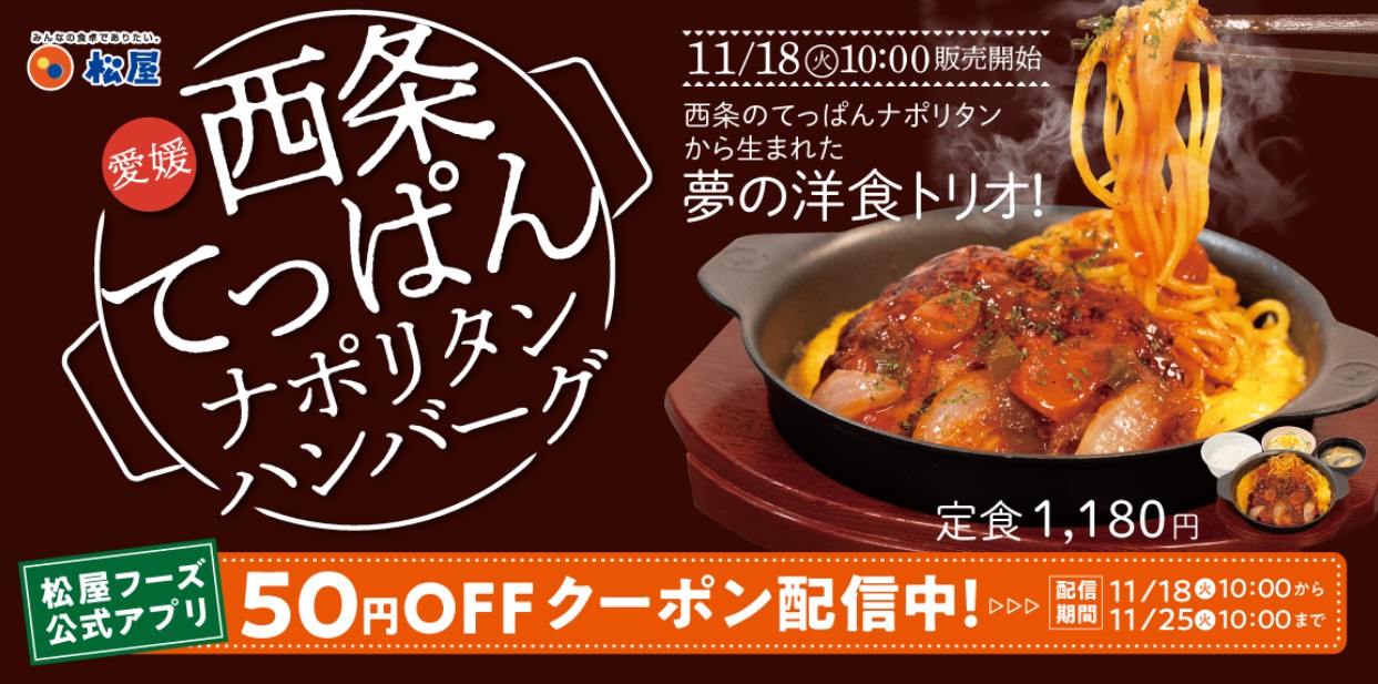 今回の「西条てっぱんナポリタンハンバーグ」松屋によると