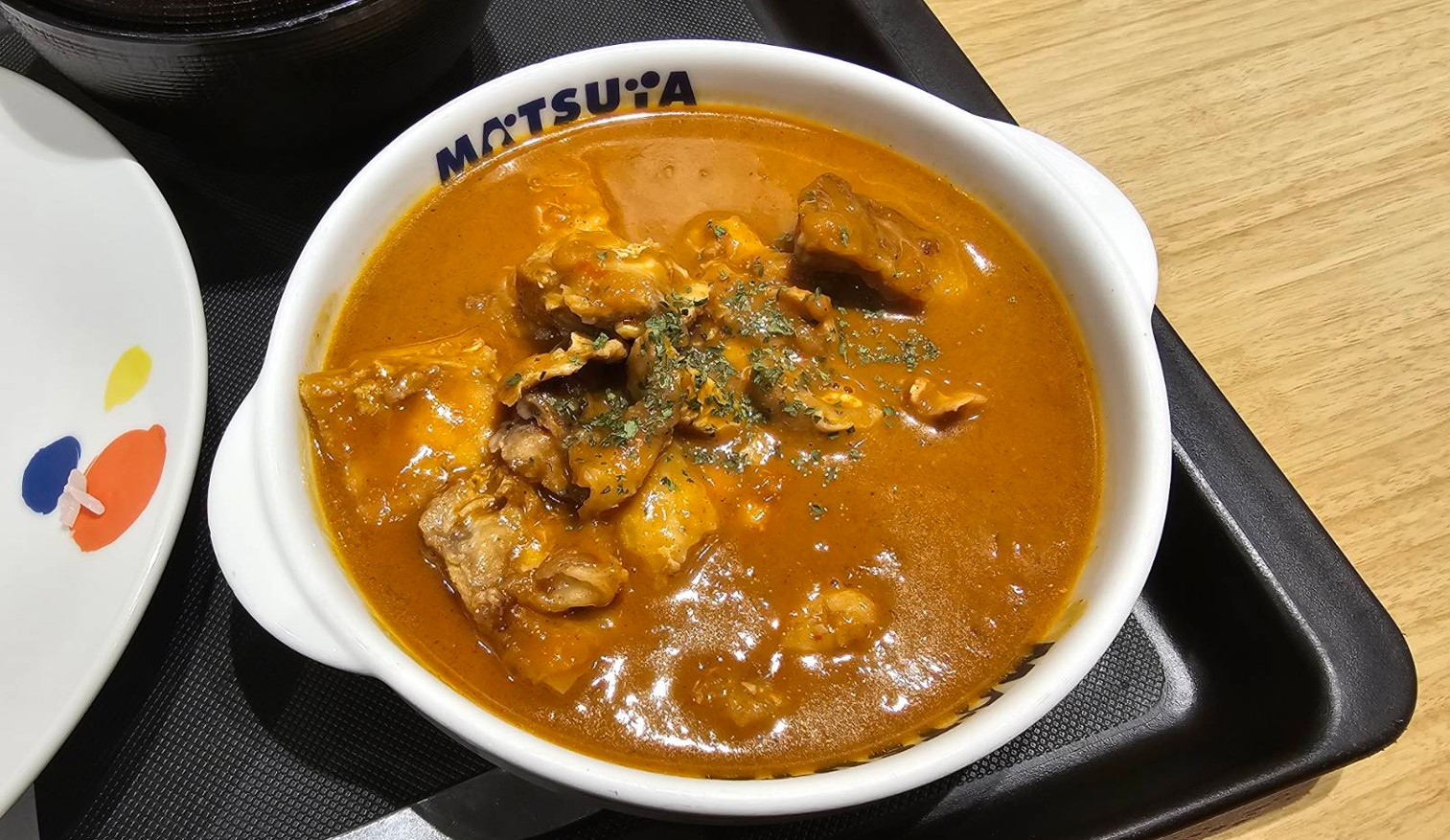 濃厚なココナッツミルクの甘みとコク、スパイスの芳醇な香り引き立つカレーソースに、鉄板でジューシーに焼き上げたごろごろ感たっぷりの鶏肉を加えて松屋流に仕上げました。