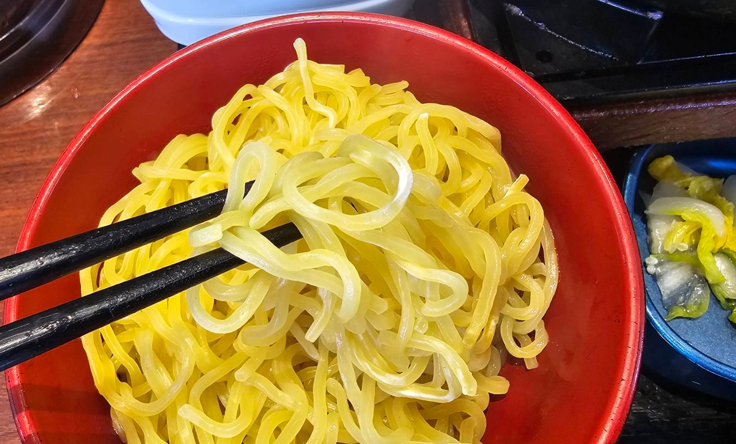 麺はこんな感じで、冷凍麺特有の白くなっている部分があります。