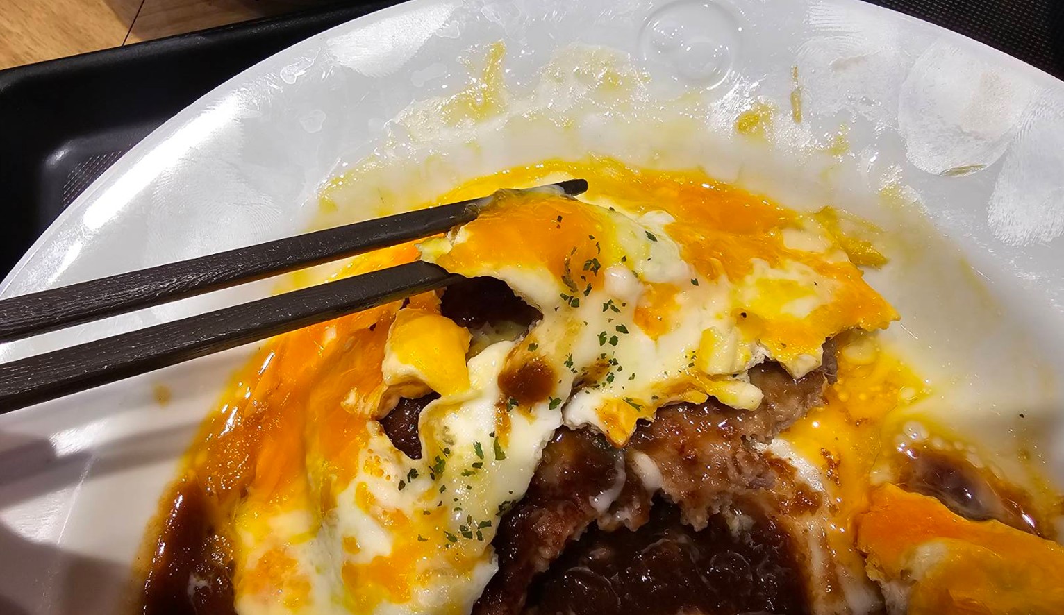 たっぷりのデミグラスと玉子2個使用のふわとろオムレツで幸福感満点のハンバーグ定食。