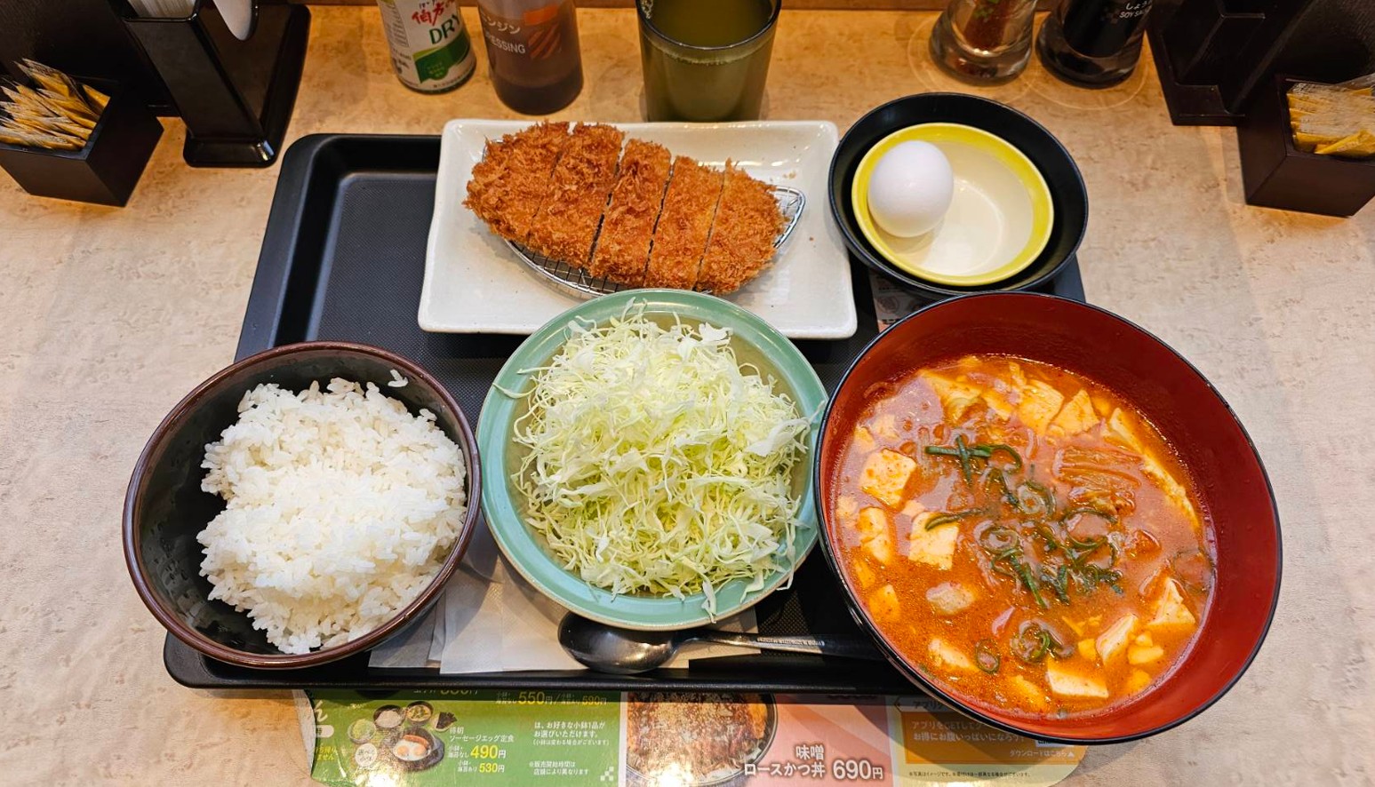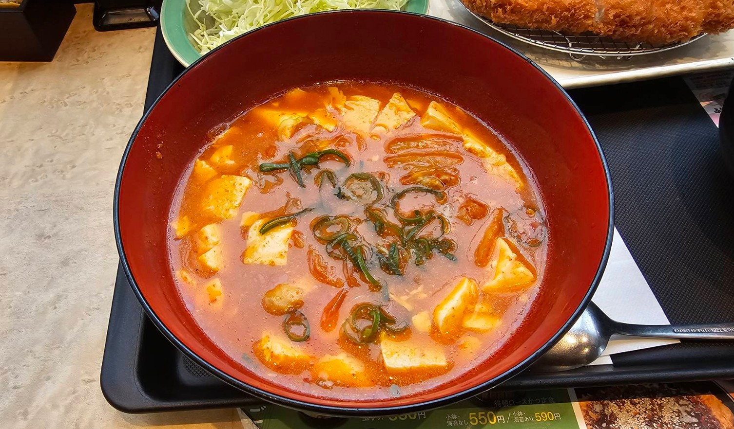鶏豆腐キムチチゲロースかつ定食 到着