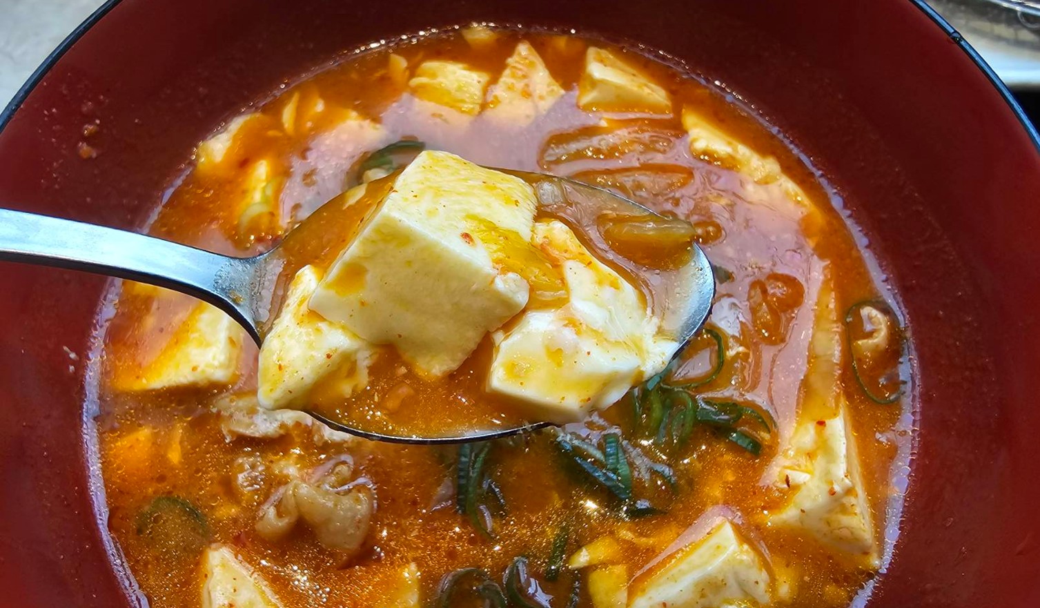 旨味溢れる海鮮だしのチゲスープに、ゴロっと鶏肉、豆腐、青ねぎの具材をたっぷりと。