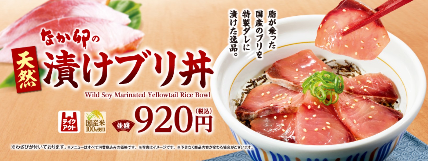 「天然漬けブリ丼」は、脂が乗った国産のブリをなか卯の特製ダレに漬け込み、ごはんの上にたっぷりと盛り付けた商品です。
