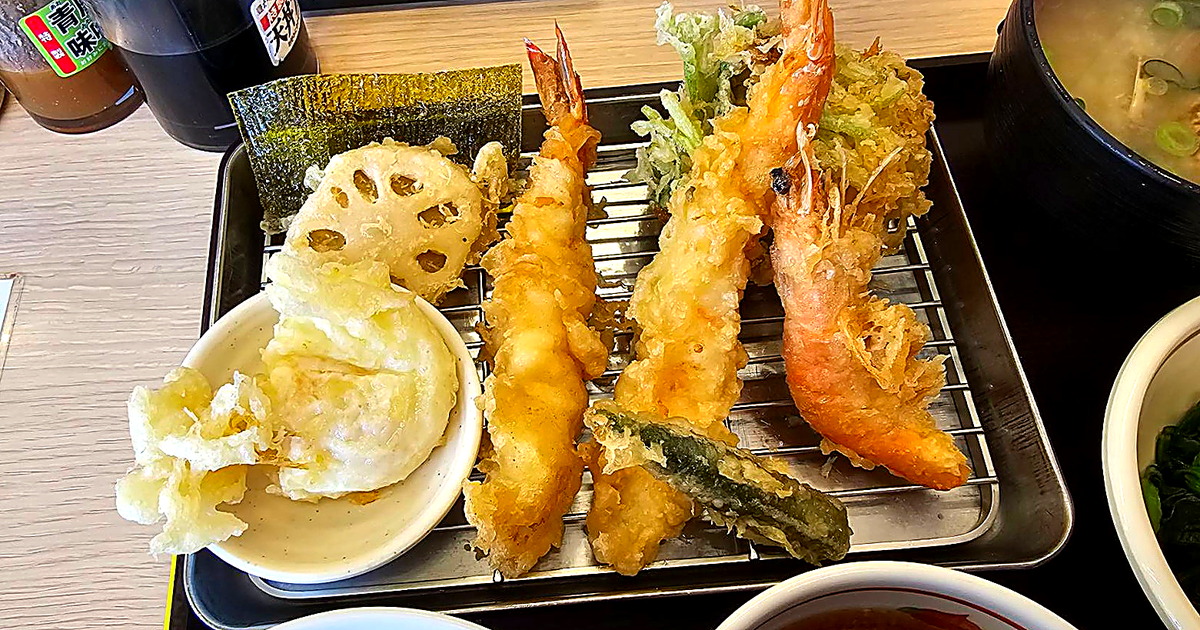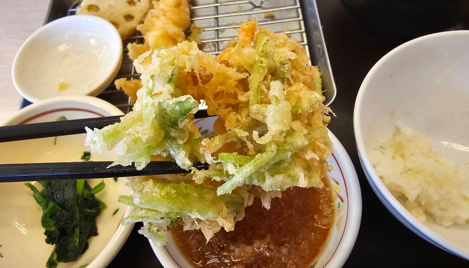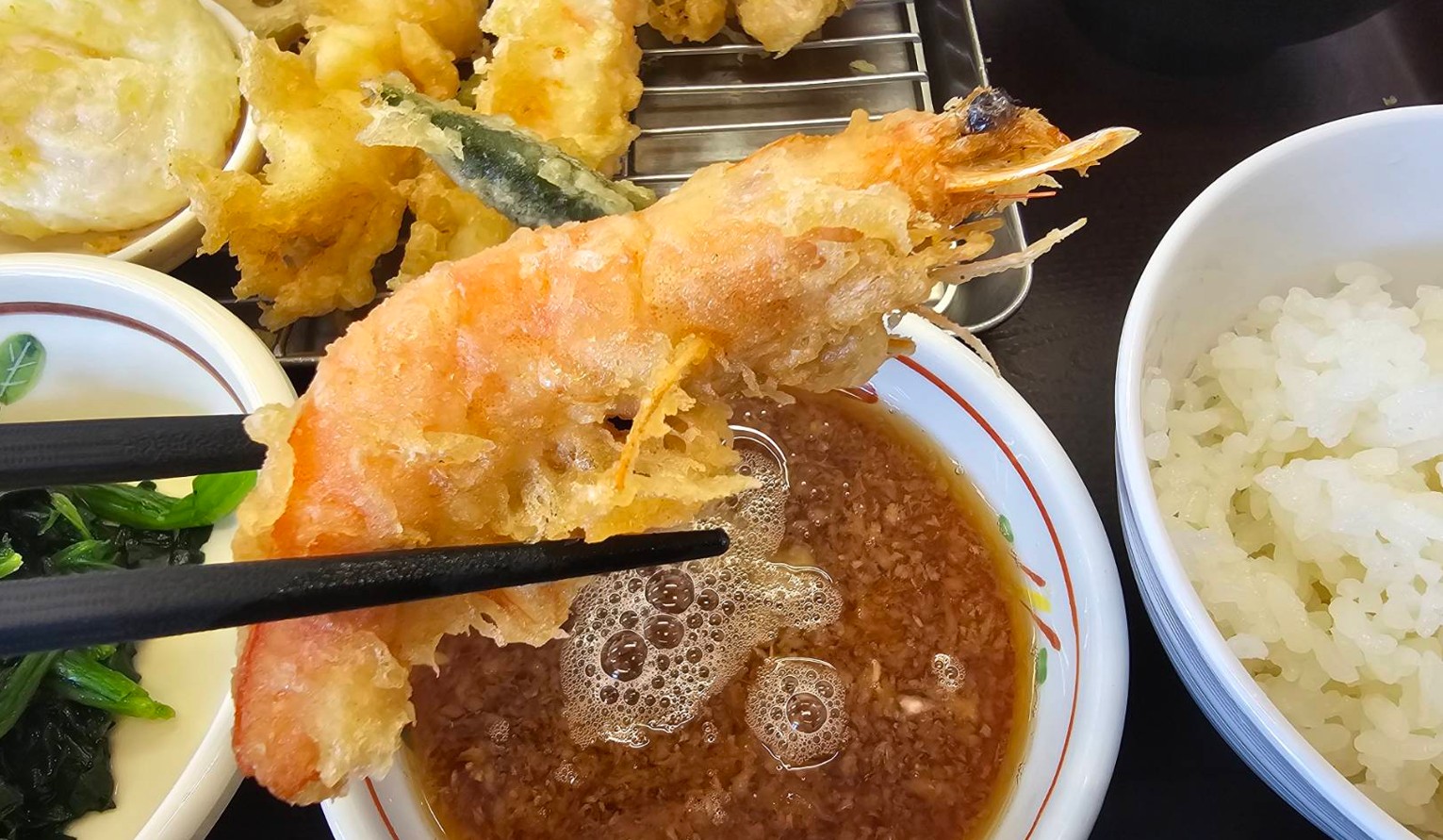 さん天の「海老づくし天ぷら定食」は、海老天の食べ応えとかき揚げのサックサク感が強い定食でした。