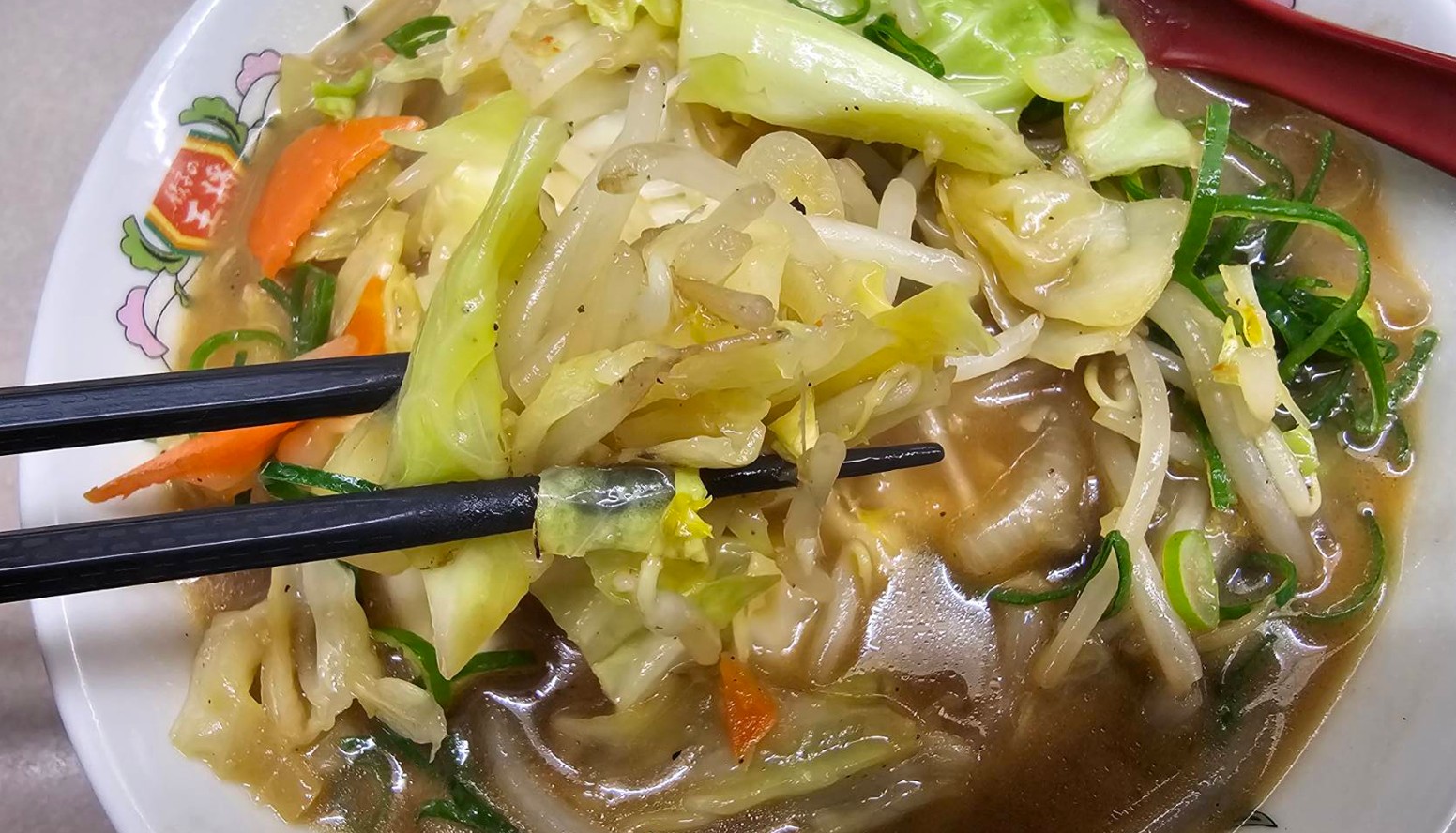 餃子の王将の野菜煮込みラーメンは、優しい味噌味のスープ、食べ慣れた平打麺、そしてたっぷり入ったシャキシャキ野菜が印象に残る一杯でした。