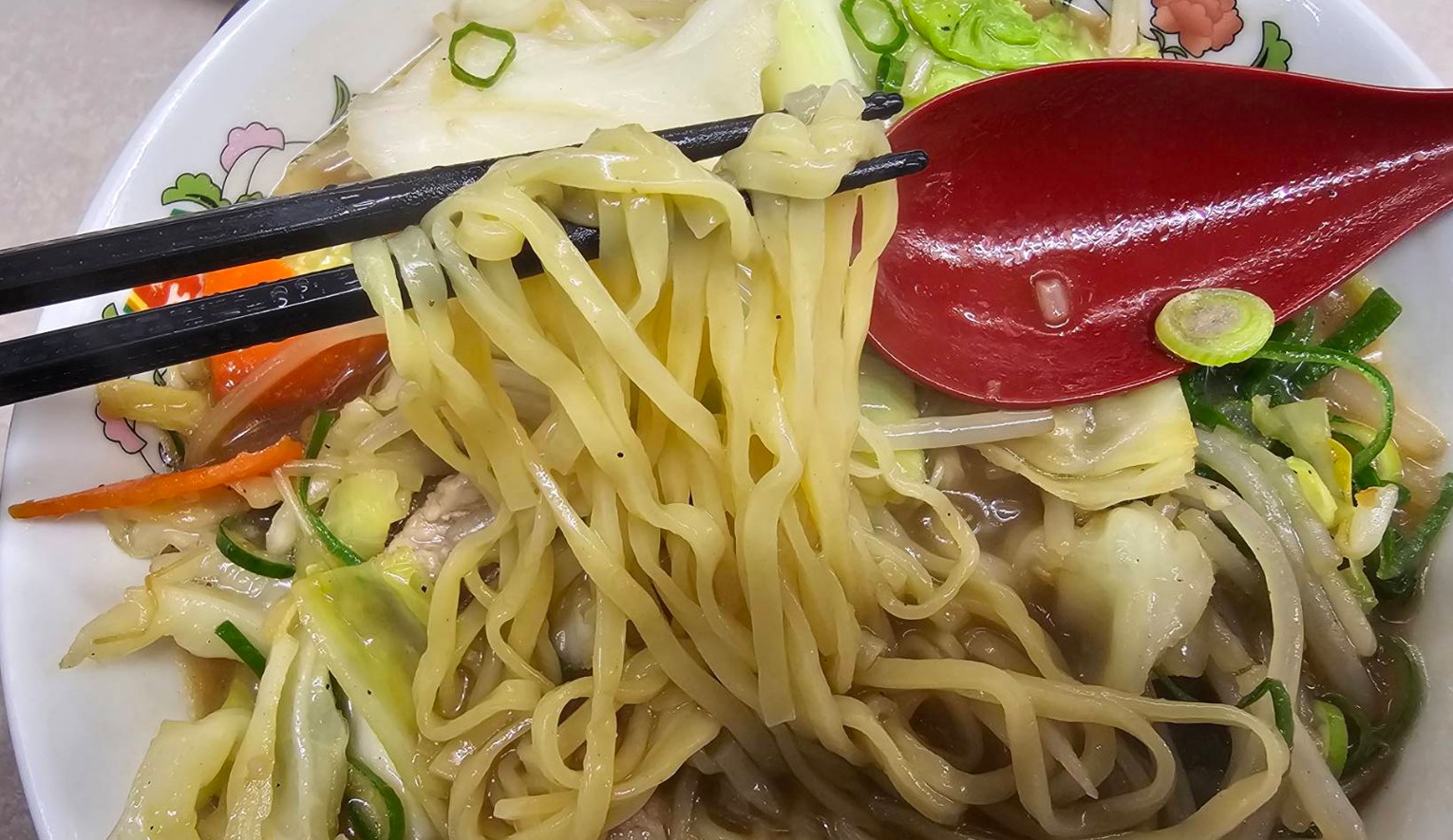 名前のとおり野菜がたっぷり入った一杯で、優しい味噌味のスープといつもの平打麺の組み合わせがどんな仕上がりなのか気になっていたメニューです。