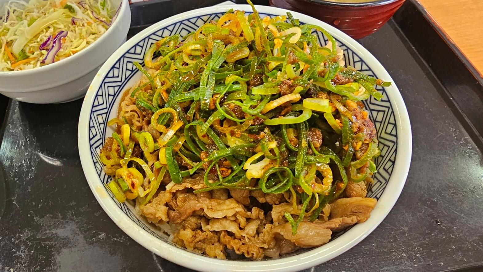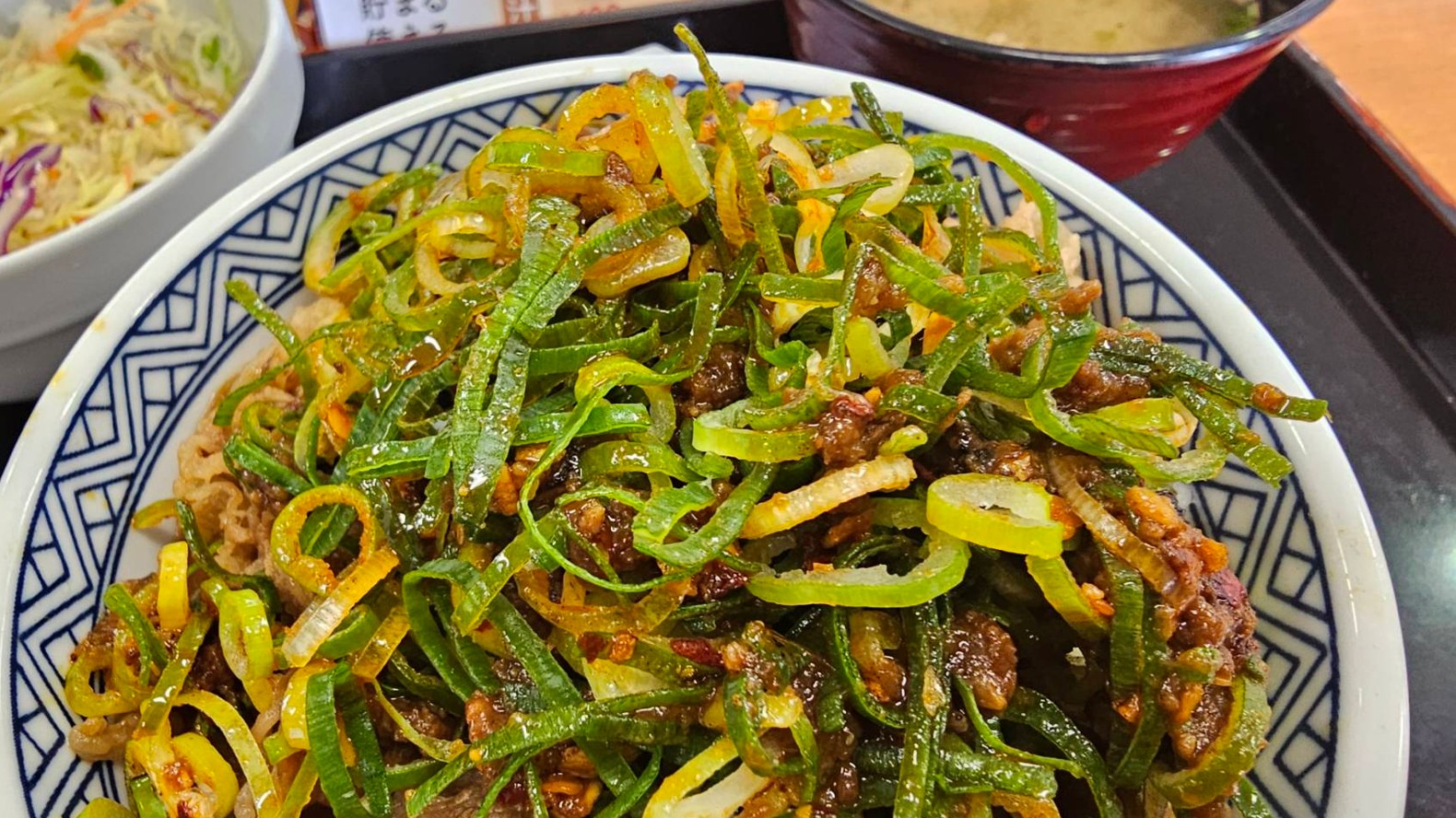 ラー油が効いたシャキシャキのねぎに、ほんのり甘めの肉味噌を合わせた、いつもの牛丼とはちょっと違う変わり種メニューです。