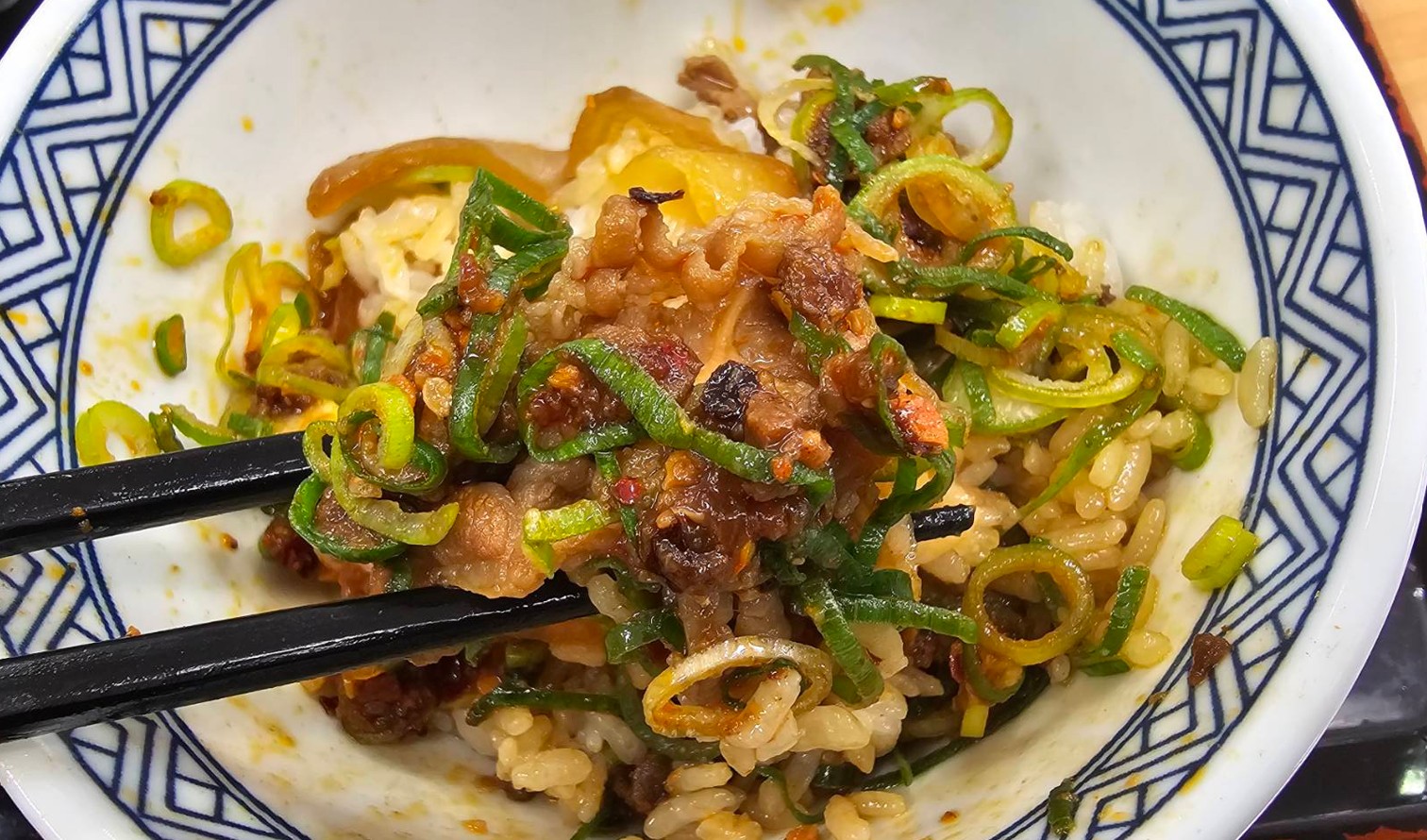 吉野家肉味噌ねぎ牛丼は、ラー油が効いたシャキシャキねぎと、ほんのり甘めの肉味噌が楽しめる変わり種の牛丼でした。