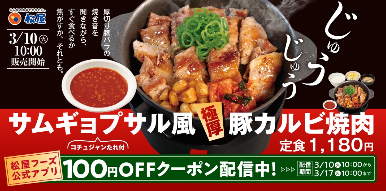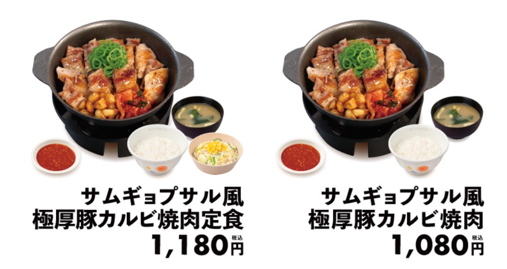 松屋のサムギョプサル風極厚豚カルビ焼肉定食は、ごま油の香りが効いた極厚豚カルビに、にんにくやキムチ、コチュジャンだれを合わせて楽しめる韓国風の焼肉定食メニューです。