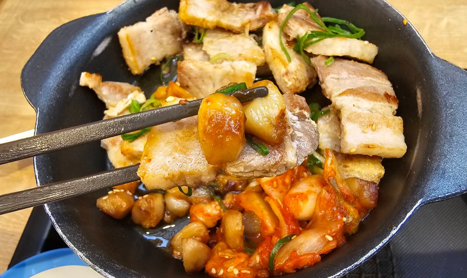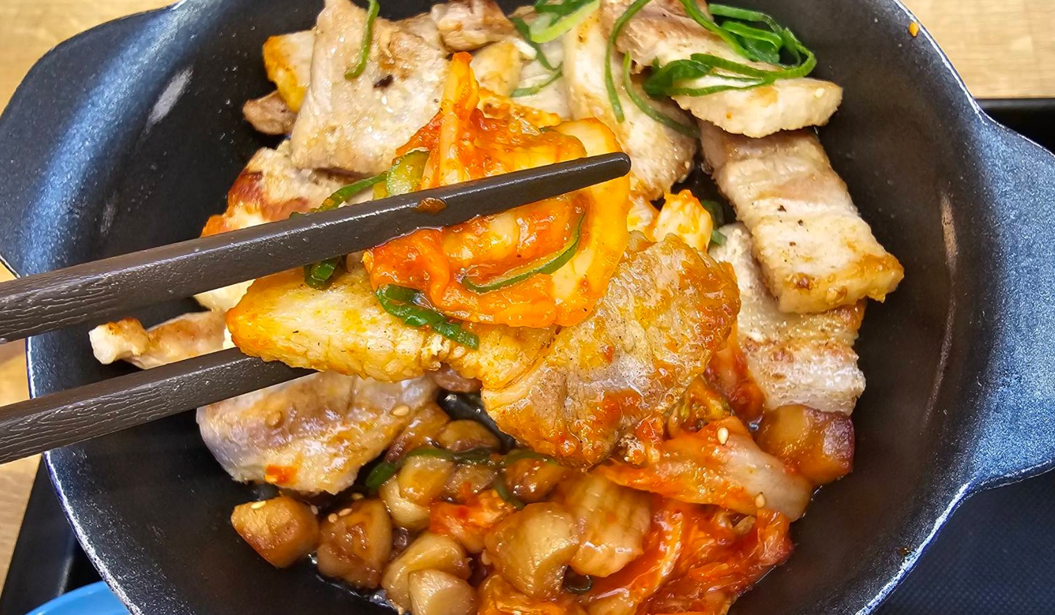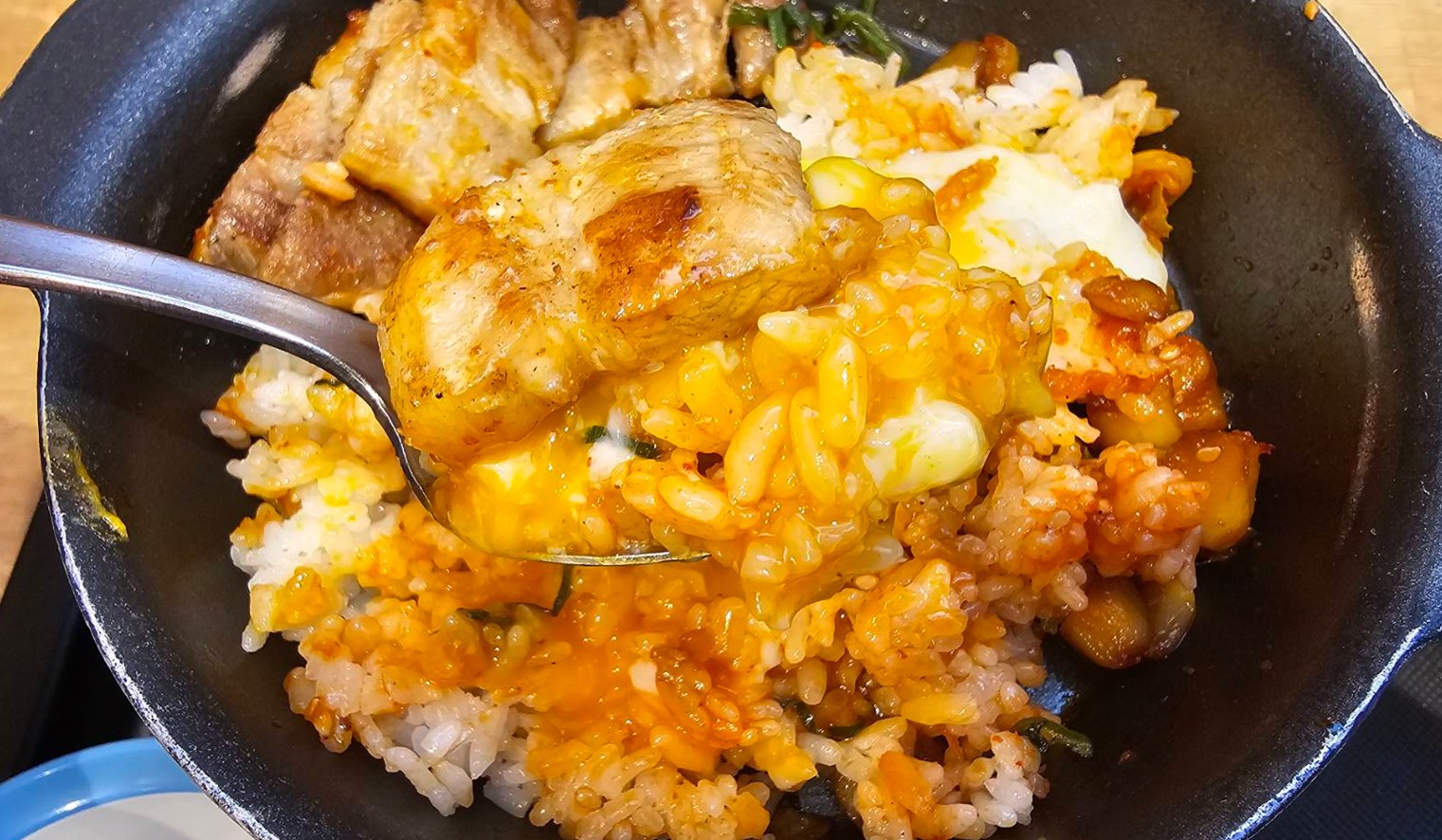 席に届いた瞬間から、ごま油とにんにくの香りがかなり強く立ち上がってきて、食べる前から期待感が高まりました。鉄板でジュウジュウしている感じも良くて、見た目の時点でかなり満足感があります。