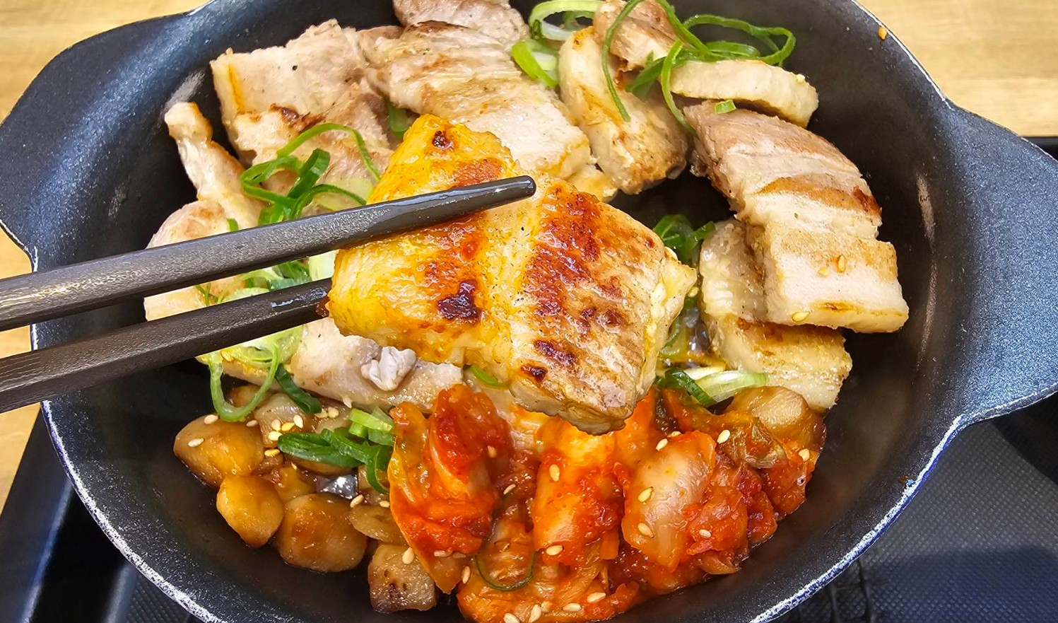 にんにく、キムチ、コチュジャンだれと、食べ方を変えながら楽しめるのがこのメニューの強みだと思います。