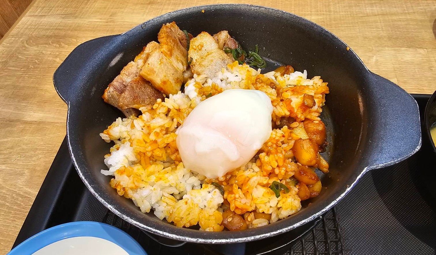 鉄板の上に残った旨みや油を活かして、ご飯と具材を合わせるように食べると、チャーハン風の締めとして楽しめます。温泉卵おすすめです。