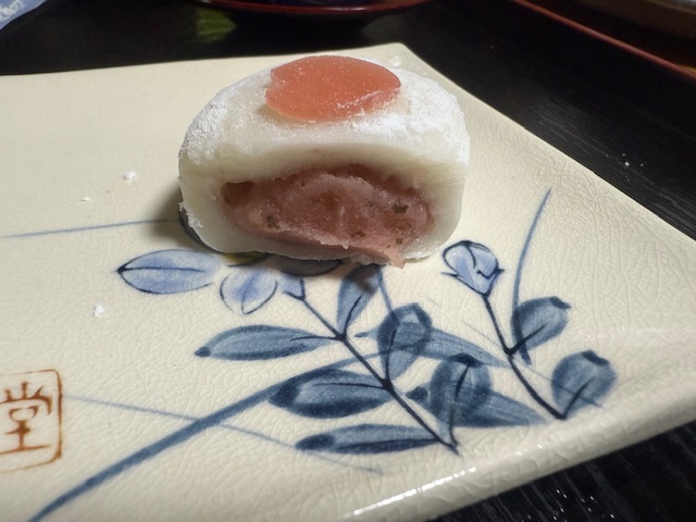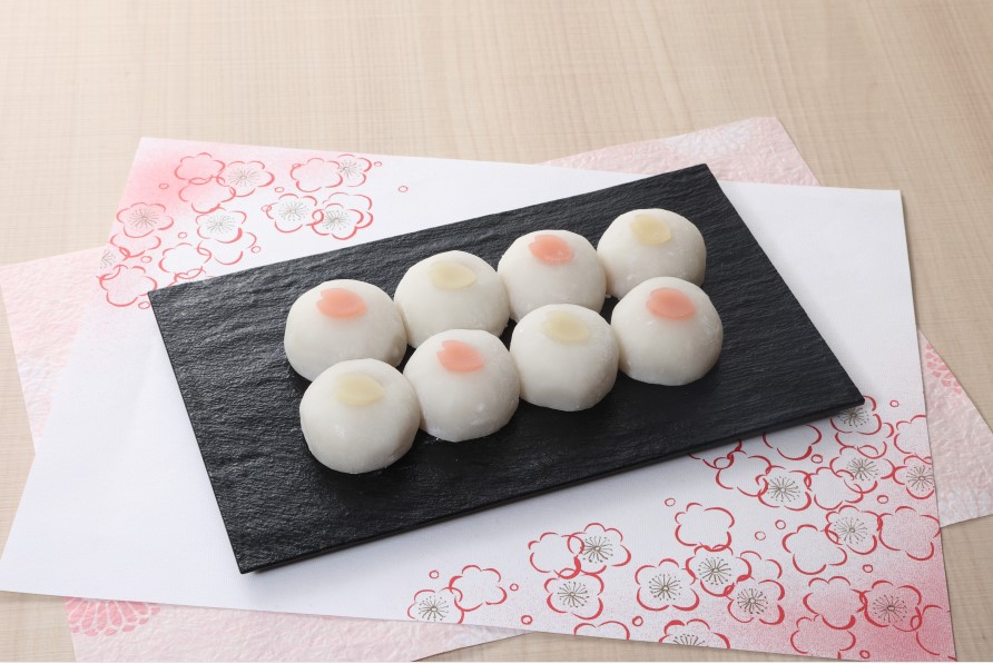 桜大福には、花びらに仕立てた紅白の羊羹が添えられており、