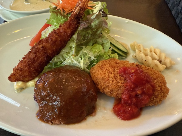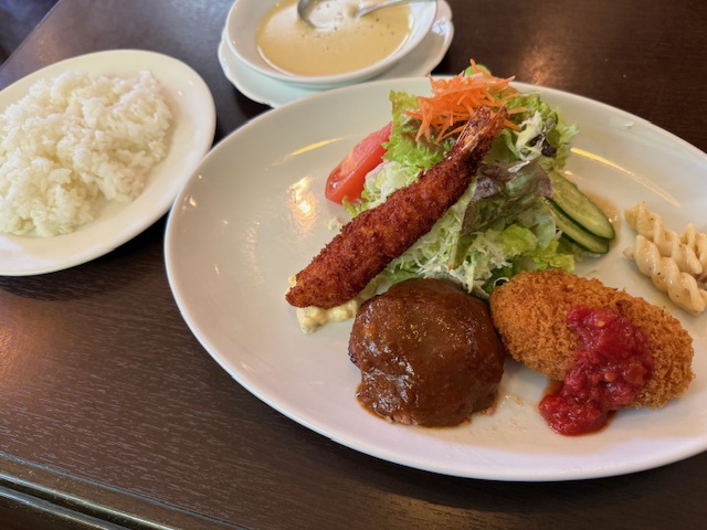 ハンバーグはとっても柔らかくジューシー。エビフライも肉厚!コロッケはクリームたっぷり。