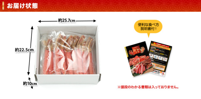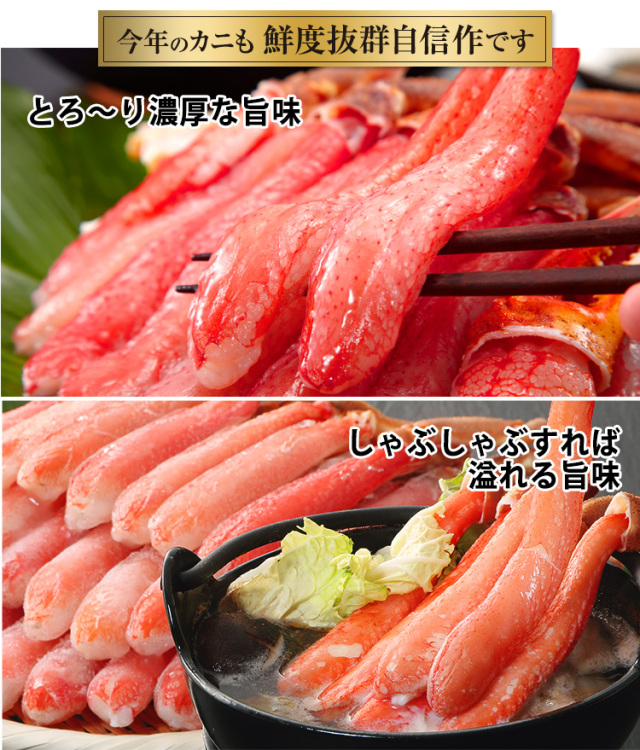 食べる直前に5~10分ほど流水で解凍してください。 【注意】冷蔵庫や常温で数時間放置するとカニが黒変する場合がございます。 |