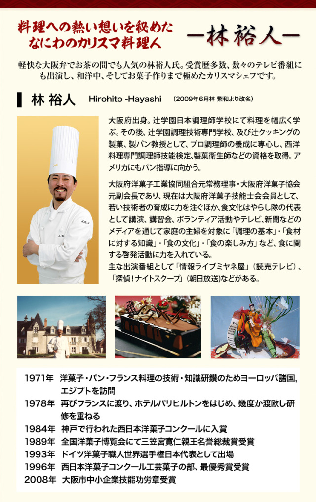 軽快な大阪弁でお茶の間でも人気の林裕人氏。受賞歴多数、数々のテレビ番組にも出演し、和洋中、そしてお菓子作りまで極めたカリスマシェフです。