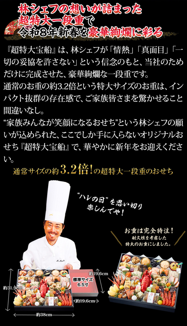 超特大宝船は、通常サイズの3.2倍、完全特注の特大お重に、おせちの定番料理はもちろん、林シェフならではのオリジナル料理が満載!