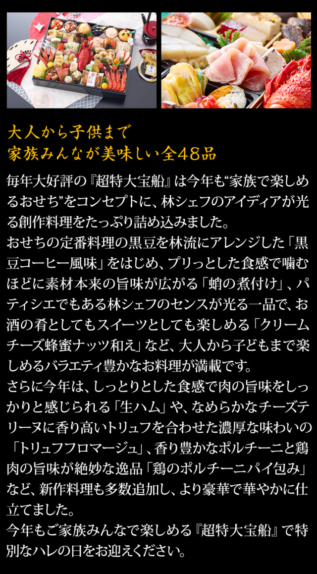 “家族みんなが笑顔になるおせち”という林シェフの願いが込められた、ここでしか手に入らないオリジナルおせち『超特大宝船』で、華やかに新年をお迎えください。