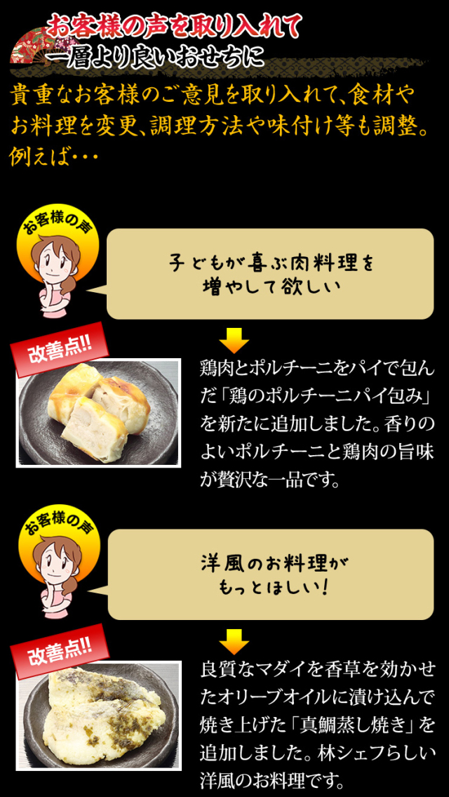 いつにも増して忙しい年末に、主婦の方々がおせちを全部作るのは大変。「お正月に家族みんなでゆっくり過ごす時間を手助けができるようにこのおせちと家族が喜ぶ得意料理やお雑煮を付け足すことで、ご家庭のお正月料理を完成させてほしい」との林シェフの願いが込められています。