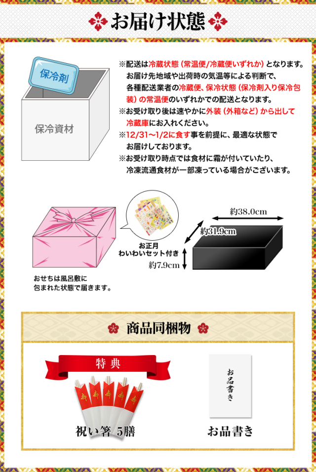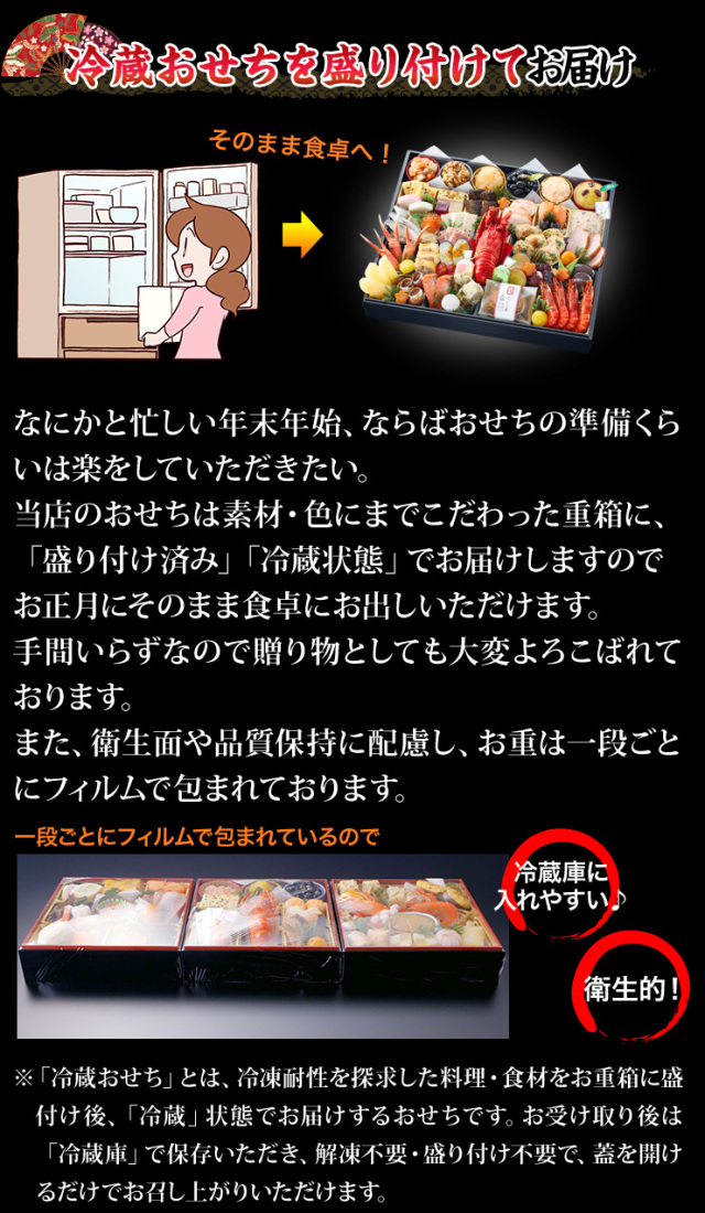 ※「冷蔵おせち」とは、冷凍耐性を探求した料理・食材をお重箱に盛付け後、「冷蔵」状態でお届けするおせちです。お受け取り後は「冷蔵庫」で保存いただき、解凍不要・盛り付け不要で、蓋を開けるだけでお召し上がりいただけます。