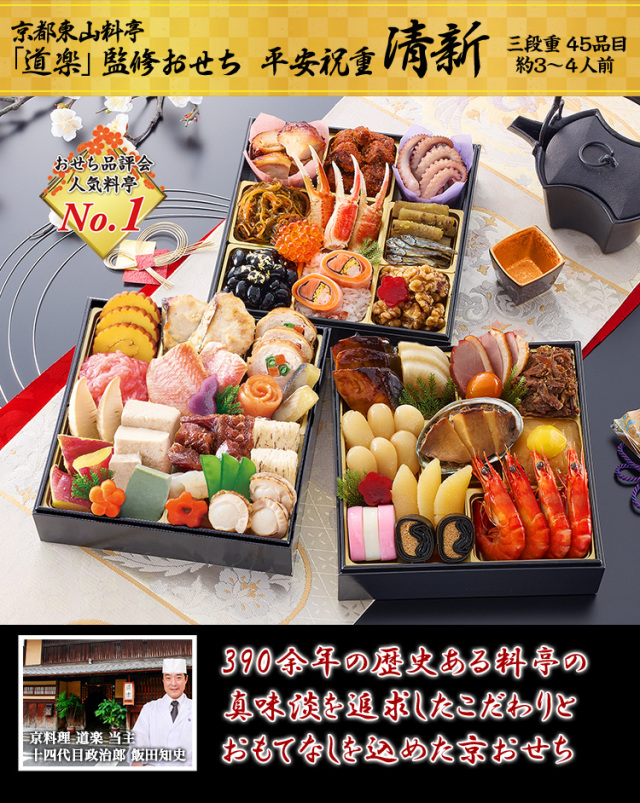 みなさまにご満足いただけるようおせち『清新』は毎年改良を行っており、今年は新たに江戸期より伝承される焼物である「金目鯛幽庵焼」や酢で締めたニシンと数の子を合わせた「親子鰊」など多彩なお料理を盛り込みました。さらに、道楽の伝統に従い五色をバランス良く配置した上品な盛り付けを守りながら、昨年以上の華やかさで、新年の食卓を彩る美しい盛り付けに力を入れました。伝統を受け継ぐ当主の感性が光る、素材本来の味わいを引き立てる技と、雅やかな彩りの調和をどうぞお愉しみください。
