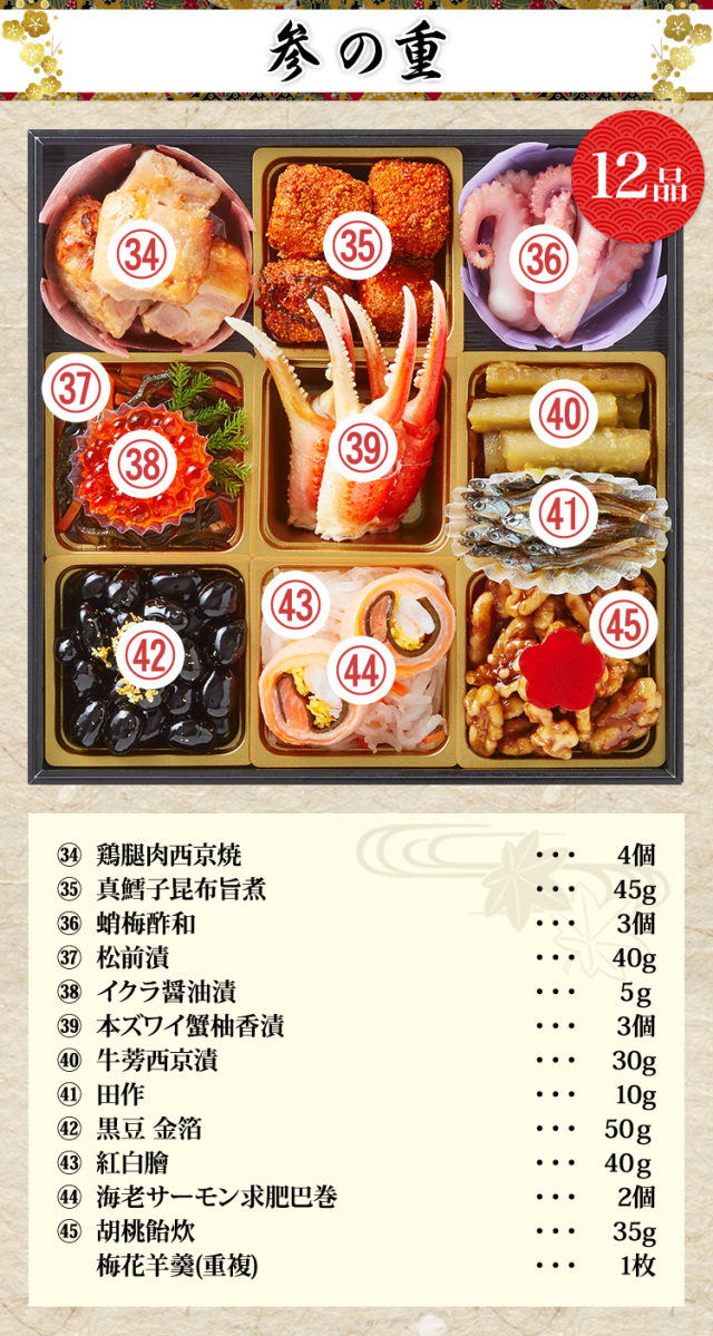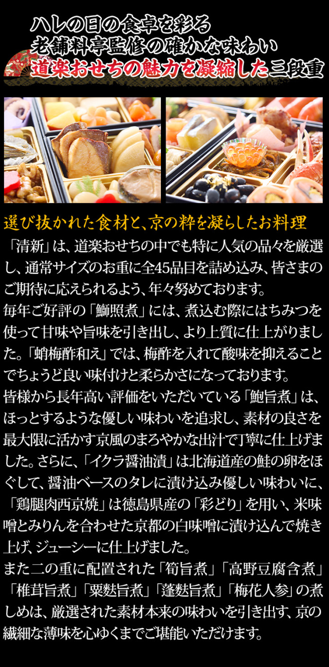 「清新」は、道楽おせちの中でも特に人気の品々を厳選し、通常サイズのお重に全45品目を詰め込み、皆さまのご期待に応えられるよう、年々努めております。