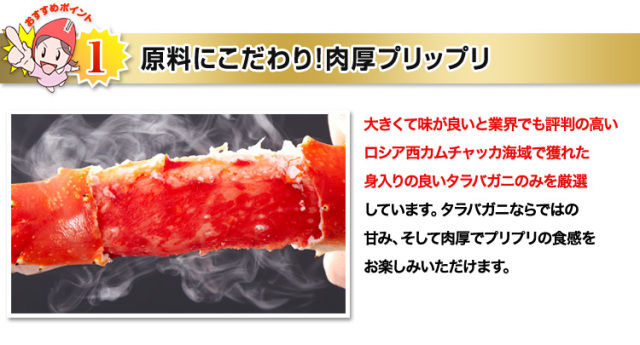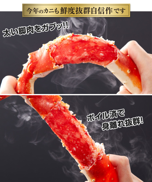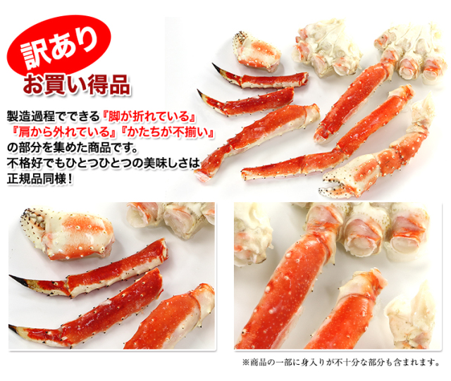 訳あり折れタラバ肩足は前回購入した時にお得で実入りも良かったので今回も購入してみました。今回もお得感がいっぱいでよかったです。カニの実入りは自分のような素人ではわからないので、特に通販などでは今までは心配で買えなかったのですが複数回購入してハズレが一度もないので、これからもそちらで購入しようと思います。ありがとうございました。
