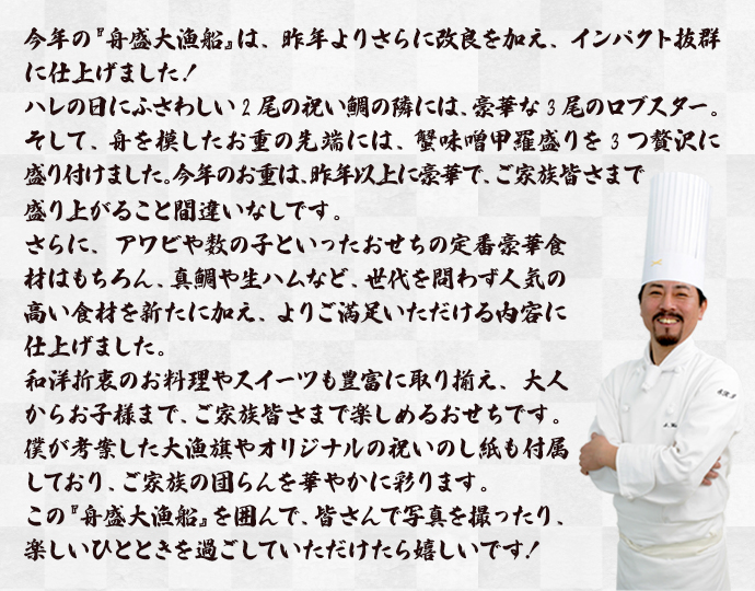 登場以来、その圧倒的な存在感と驚きで多くの注目を集めてきたおせち「舟盛大漁船」。
