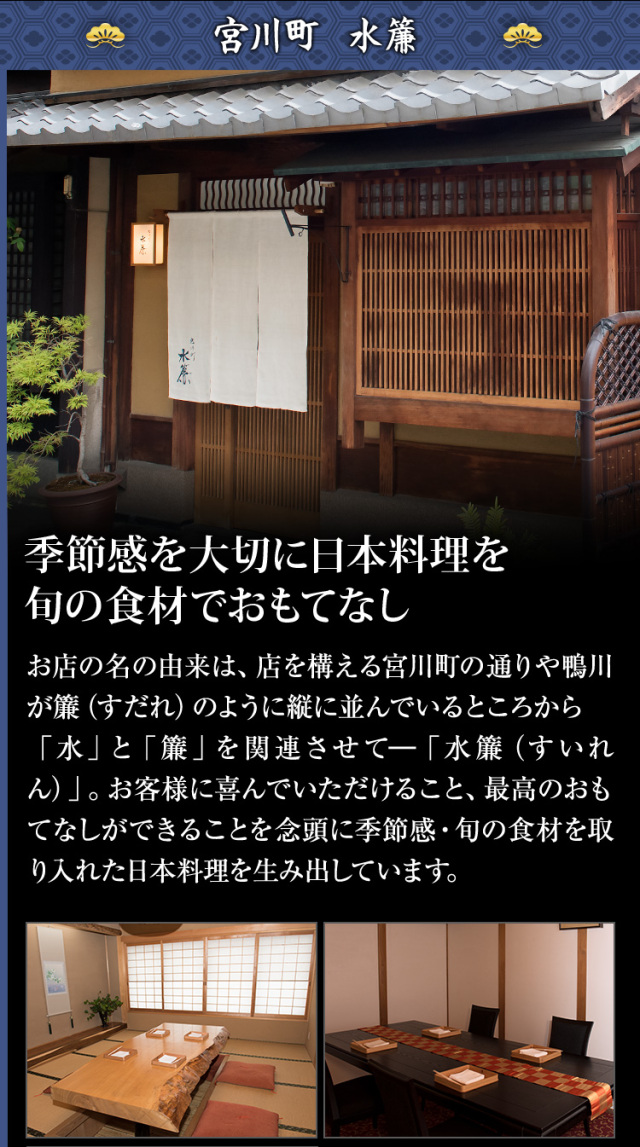 お店の名の由来は、店を構える宮川町の通りや鴨川が簾(すだれ)のように縦に並んでいるところから「水」と「簾」を関連させて―「水簾(すいれん)」。お客様に喜んでいただけること、最高のおもてなしができることを念頭に季節感・旬の食材を取り入れた日本料理を生み出しています。