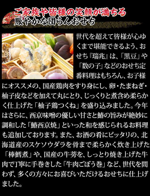 世代を超えて皆様が心ゆくまで堪能できるよう、おせち『瑞兆』は、「黒豆」や「数の子」などのおせち定番料理はもちろん、お子様にオススメの、国産鶏肉をすり身にし、卵・たまねぎ・柚子皮などを加えて丸にとり、じっくりと煮含め柔らかく仕上げた「柚子鶏つくね」を盛り込みました。今年はさらに、西京味噌の優しい甘さと鰆の旨みが絶妙に調和した「鰆西京焼」といった和を感じられるお料理も追加しております。また、お酒の肴にピッタリの、北海道産のスケソウダラを骨まで柔らかく炊き上げた「棒鱈煮」や、国産の牛蒡を、しっとり焼き上げた牛肉で丁寧に手巻きした「牛肉ごぼう巻」など、世代を問わず、多くの方々にお喜びいただけるおせちに仕上げました。
