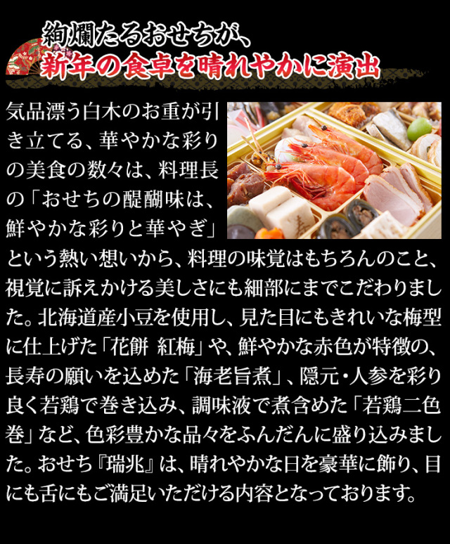 気品漂う白木のお重が引き立てる、華やかな彩りの美食の数々は、料理長の「おせちの醍醐味は、鮮やかな彩りと華やぎ」という熱い想いから、料理の味覚はもちろんのこと、視覚に訴えかける美しさにも細部にまでこだわりました。北海道産小豆を使用し、見た目にもきれいな梅型に仕上げた「花餅 紅梅」や、鮮やかな赤色が特徴の、長寿の願いを込めた「海老旨煮」、隠元・人参を彩り良く若鶏で巻き込み、調味液で煮含めた「若鶏二色巻」など、色彩豊かな品々をふんだんに盛り込みました。おせち『瑞兆』は、晴れやかな日を豪華に飾り、目にも舌にもご満足いただける内容となっております。