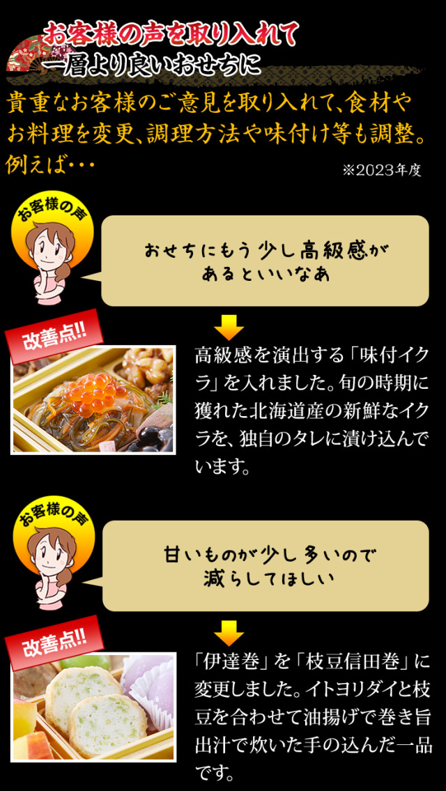 当店では毎年当店をご利用いただいているベテラン主婦の方々にお集まりいただき、おせちの試食、品評会を開催。見た目、お味、価格など様々な視点で評価をいただき改良を重ねています。近年は開催方法を変更しご試食いただく方々の各ご家庭へおせちをお届けし、アンケート方式にて実施。グルメなお客様の様々なご意見ご感想をいただきました。