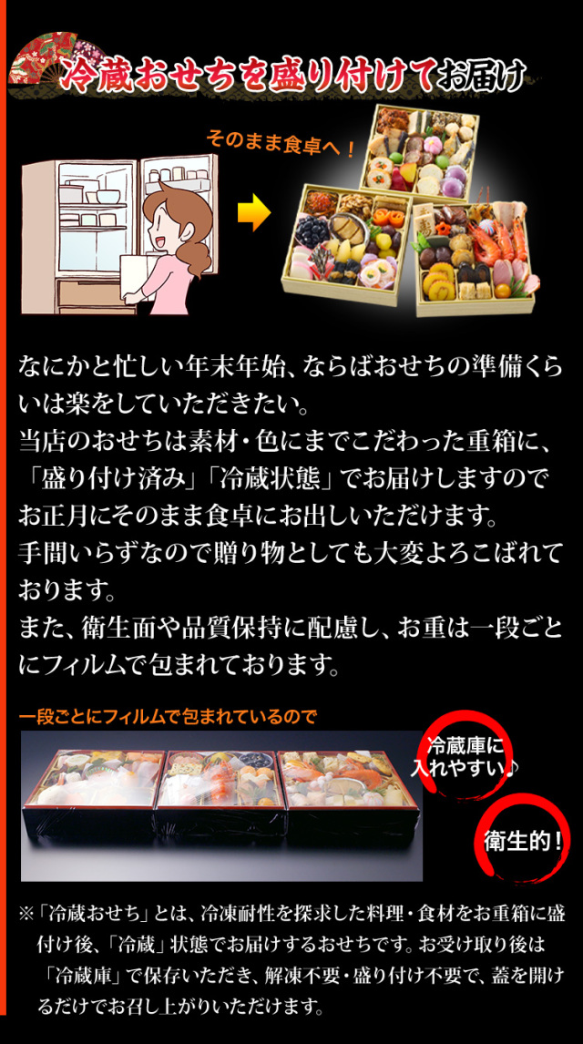 当店のおせちは素材・色にまでこだわった重箱に、「盛り付け済み」「冷蔵状態」でお届けしますので