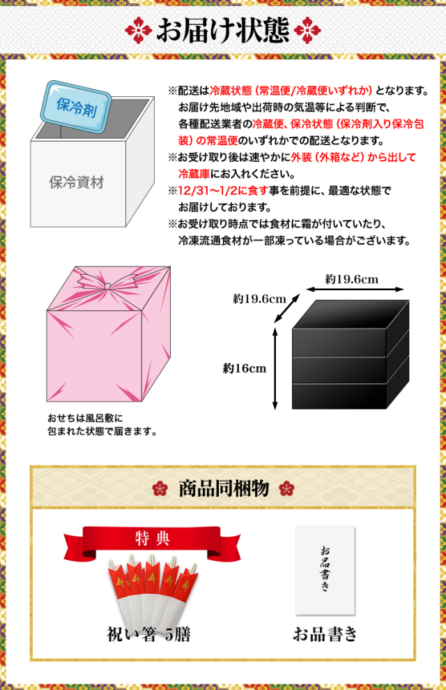 ※「冷蔵おせち」とは、冷凍耐性を探求した料理・食材をお重箱に盛付け後、「冷蔵」状態でお届けするおせちです。お受け取り後は「冷蔵庫」で保存いただき、解凍不要・盛り付け不要で、蓋を開けるだけでお召し上がりいただけます。