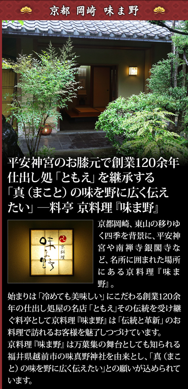 京料理『味ま野』は万葉集の舞台としても知られる福井県越前市の味真野神社を由来とし、「真(まこと)の味を野に広く伝えたい」との願いが込められています。
