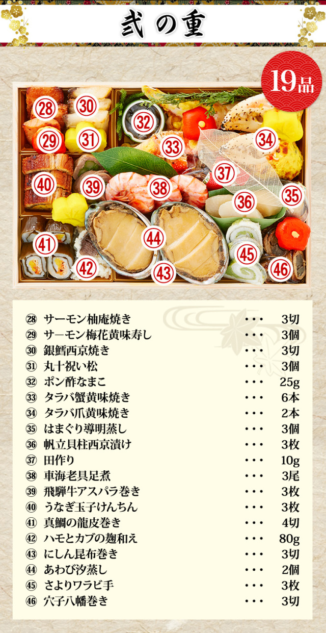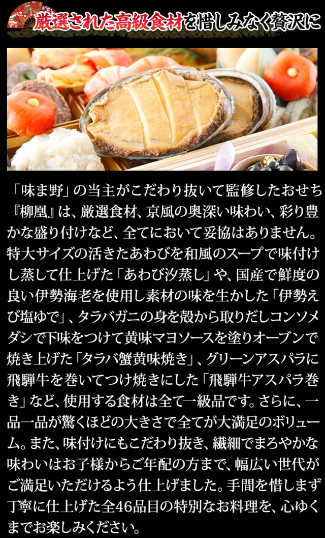 「味ま野」の当主がこだわり抜いて監修したおせち『柳凰』は、厳選食材、京風の奥深い味わい、彩り豊かな盛り付けなど、全てにおいて妥協はありません。特大サイズの活きたあわびを和風のスープで味付けし蒸して仕上げた「あわび汐蒸し」や、国産で鮮度の良い伊勢海老を使用し素材の味を生かした「伊勢えび塩ゆで」、タラバガニの身を殻から取りだしコンソメダシで下味をつけて黄味マヨソースを塗りオーブンで焼き上げた「タラバ蟹黄味焼き」、グリーンアスパラに飛騨牛を巻いてつけ焼きにした「飛騨牛アスパラ巻き」など、使用する食材は全て一級品です。さらに、一品一品が驚くほどの大きさで全てが大満足のボリューム。また、味付けにもこだわり抜き、繊細でまろやかな味わいはお子様からご年配の方まで、幅広い世代がご満足いただけるよう仕上げました。手間を惜しまず丁寧に仕上げた全46品目の特別なお料理を、心ゆくまでお楽しみください。