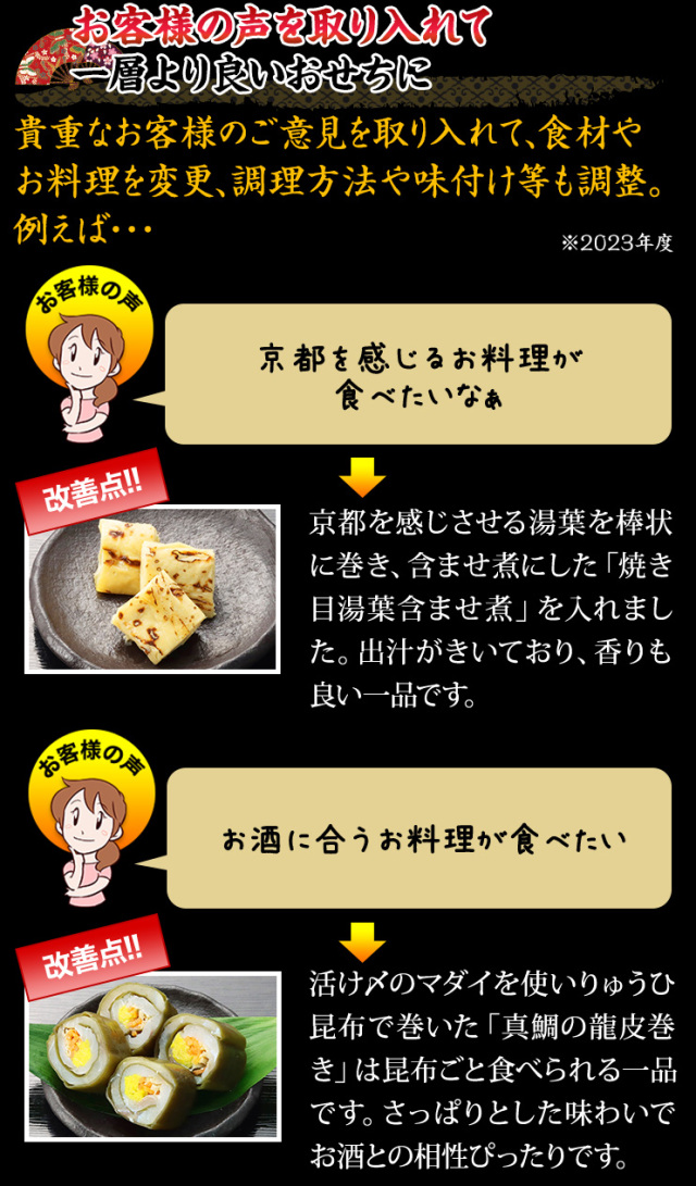 当店では毎年当店をご利用いただいているベテラン主婦の方々にお集まりいただき、おせちの試食、品評会を開催。見た目、お味、価格など様々な視点で評価をいただき改良を重ねています。近年は開催方法を変更しご試食いただく方々の各ご家庭へおせちをお届けし、アンケート方式にて実施。グルメなお客様の様々なご意見ご感想をいただきました。