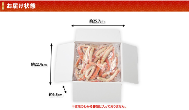 | 備考 | ※ボイル済みの蟹は一度茹で済の為、鍋には向きません。 どうしても鍋に入れたい場合は、解凍後、他の具材が煮えた一番最後のタイミングでサッと温める程度にしてください。加熱しすぎると身が固くなったり、身が殻にひっつき身離れが悪くなりますのでご注意ください。 |