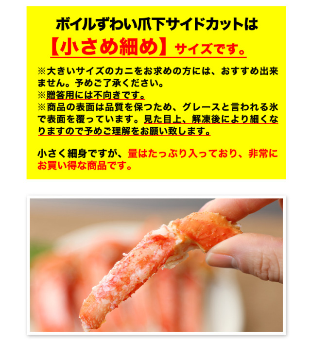 | 商品名 | ボイルずわい爪下サイドカット1kg超(総重量約1.1kg) |