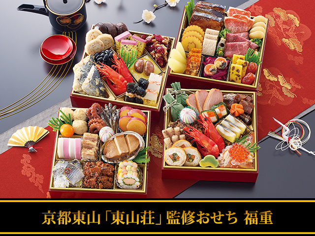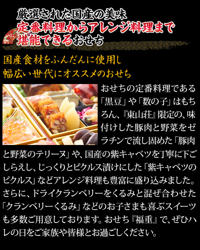 おせちの定番料理である「黒豆」や「数の子」はもちろん、『東山荘』限定の、味付けした豚肉と野菜をゼラチンで流し固めた「豚肉と野菜のテリーヌ」や、国産の紫キャベツを丁寧に下ごしらえし、じっくりとピクルス漬けにした「紫キャベツのピクルス」などアレンジ料理も豊富に盛り込みました。さらに、ドライクランベリーをくるみと混ぜ合わせた「クランベリーくるみ」などのお子さまも喜ぶスイーツも多数ご用意しております。おせち『福重』で、ぜひハレの日をご家族や皆様とお過ごしください。