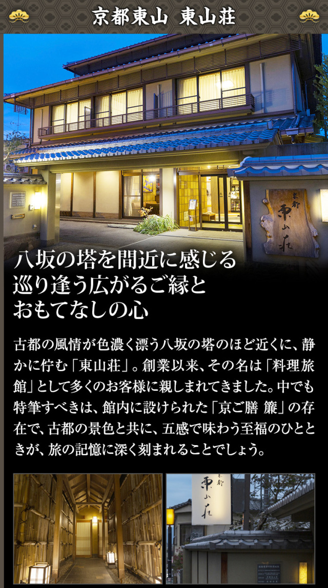 おもてなしの心古都の風情が色濃く漂う八坂の塔のほど近くに、静かに佇む「東山荘」。創業以来、その名は「料理旅館」として多くのお客様に親しまれてきました。中でも特筆すべきは、館内に設けられた「京ご膳 簾」の存在で、古都の景色と共に、五感で味わう至福のひとときが、旅の記憶に深く刻まれることでしょう。