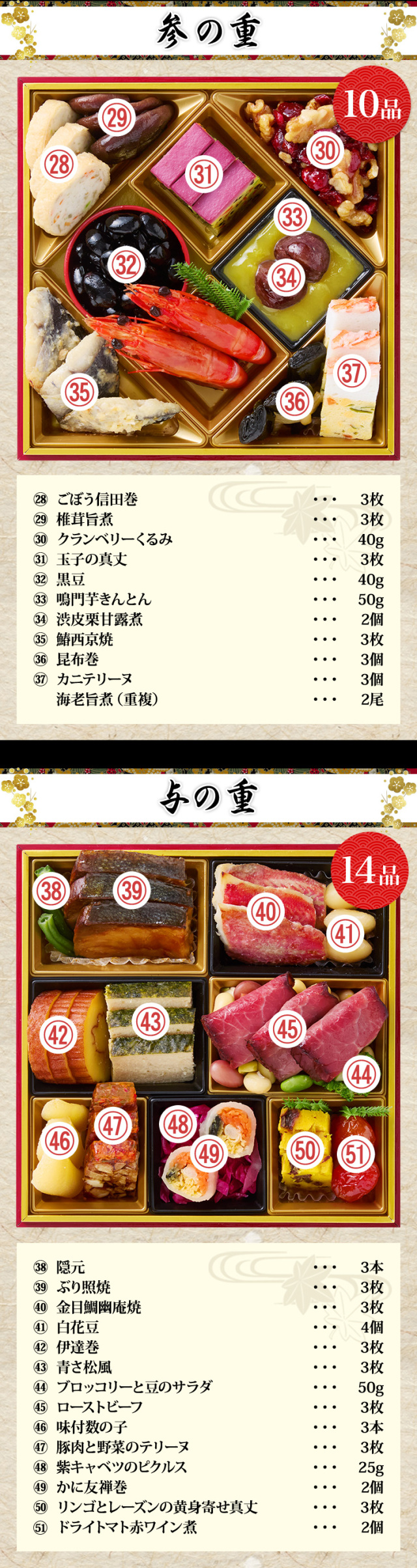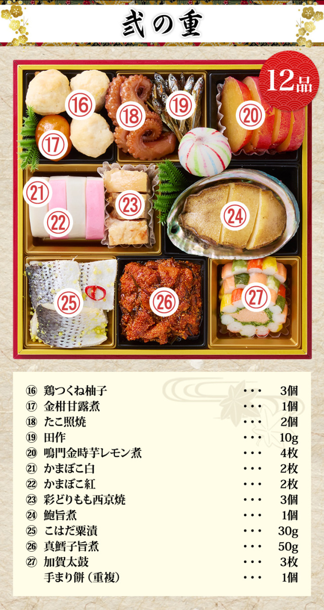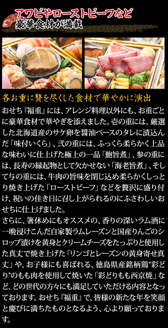 さらに、箸休めにもオススメの、香りの深いラム酒に一晩浸けこんだ自家製ラムレーズンと国産りんごのシロップ漬けを黄身とクリームチーズをたっぷりと使用した真丈で焼き上げた「リンゴとレーズンの黄身寄せ真丈」や、お子様にも喜ばれる、徳島県産銘柄鶏“彩どり”のもも肉を使用して焼いた「彩どりもも西京焼」など、どの世代の方々にも満足していただける内容となっております。おせち『福重』で、皆様の新たな年を笑顔と慶びに満ちたものとなるよう、心より願っております。