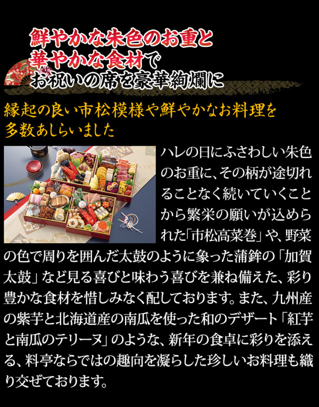 ハレの日にふさわしい朱色のお重に、その柄が途切れることなく続いていくことから繁栄の願いが込められた「市松高菜巻」や、野菜の色で周りを囲んだ太鼓のように象った蒲鉾の「加賀太鼓」など見る喜びと味わう喜びを兼ね備えた、彩り豊かな食材を惜しみなく配しております。また、九州産の紫芋と北海道産の南瓜を使った和のデザート「紅芋と南瓜のテリーヌ」のような、新年の食卓に彩りを添える、料亭ならではの趣向を凝らした珍しいお料理も織り交ぜております。