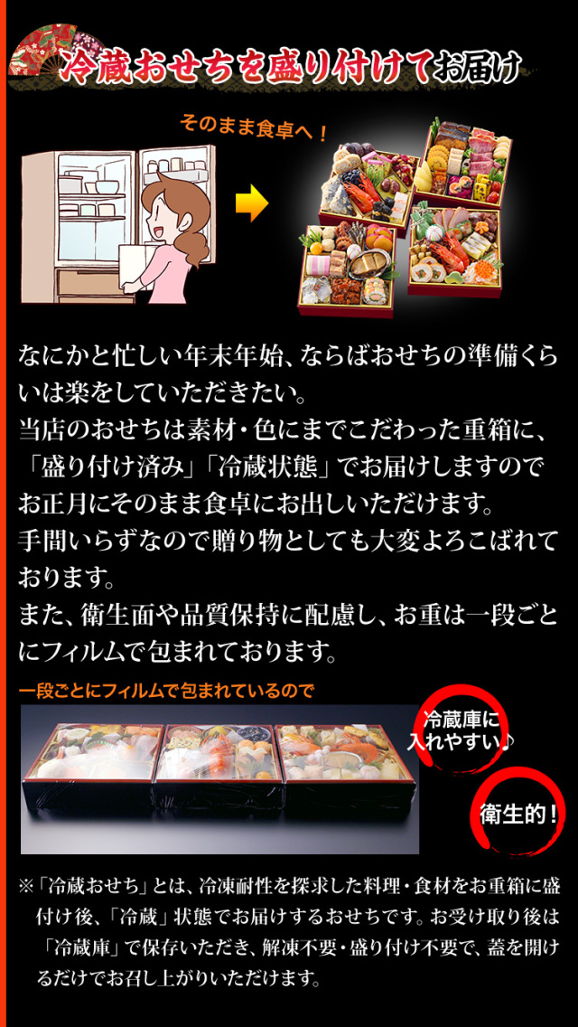 当店のおせちは素材・色にまでこだわった重箱に、「盛り付け済み」「冷蔵状態」でお届けしますのでお正月にそのまま食卓にお出しいただけます。